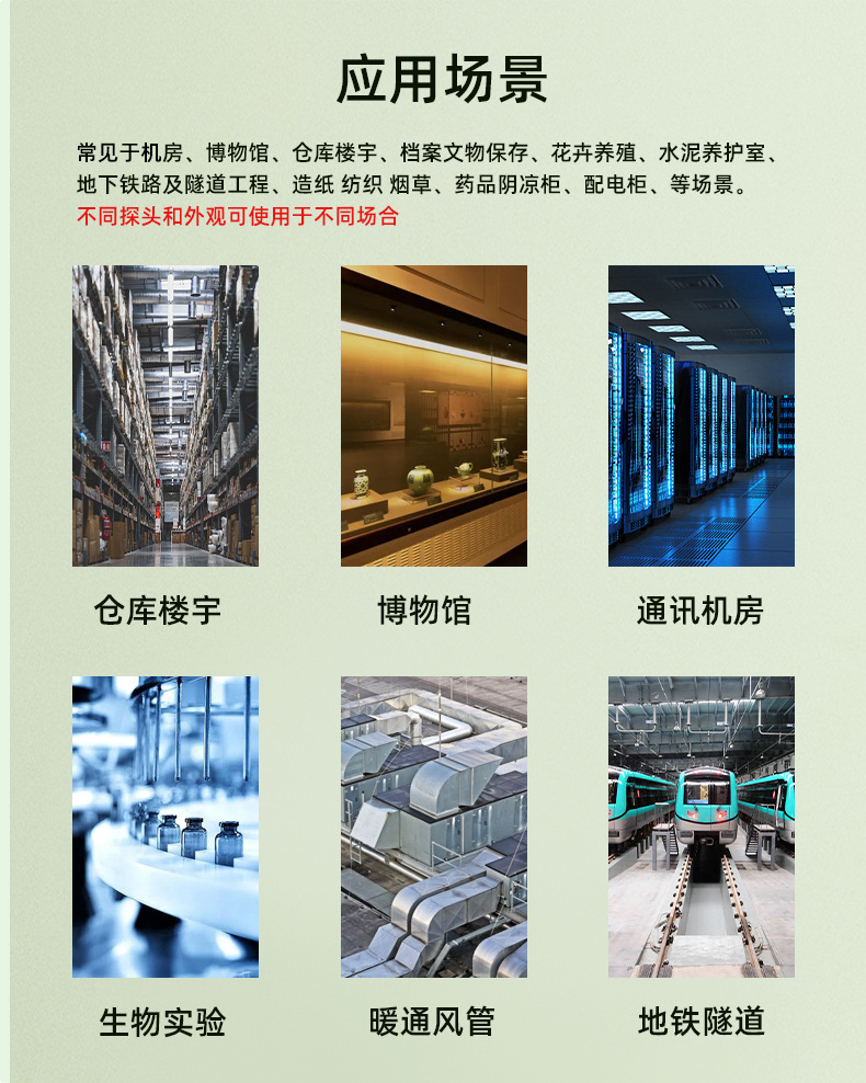 多种型号应用不同场合,应用广泛:通讯机房、仓库楼宇、畜牧养殖、药材基地、花卉养殖、造纸纺织、烟草、农业温室 、大棚、水泥养护室、档案文物保存、药品阴凉柜、配电柜、地下铁路及隧道工程等需要温湿度测量的场景。