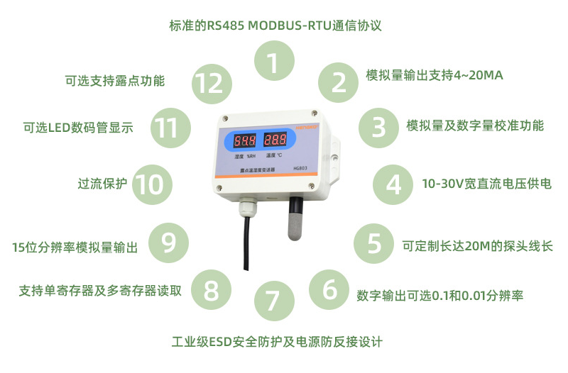 HG803系列温湿度变送器选用进口高精度测量单元,设备内置高精度温度补偿,稳定性高,漂移小,可重复性高;选用壁挂式外壳可轻松固定于墙体。数码管温湿度变送...