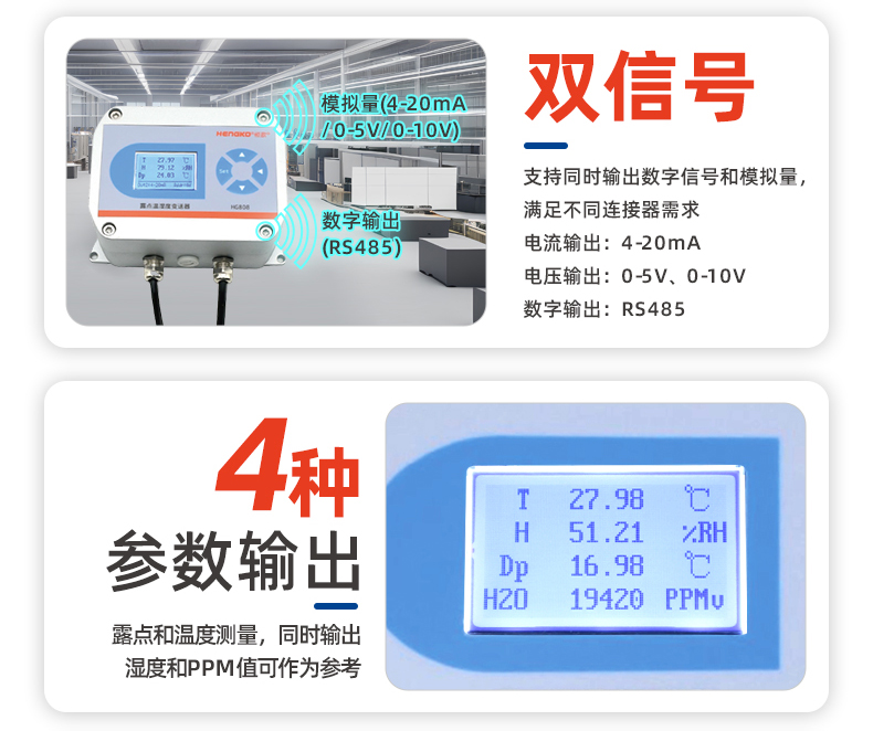 ●模拟量输出:露点+温度(湿度值仅供参考)4~20mA/0-5V/0-10V(三选一)