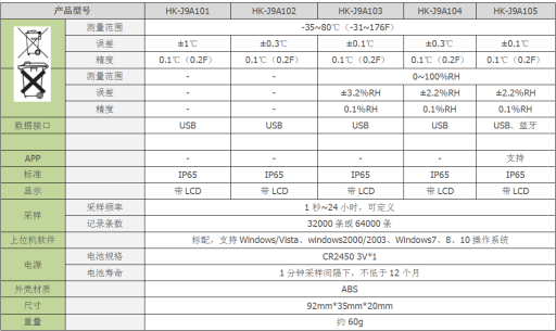 根据这四个指标来考量,我们运输的疫苗是否有做到正确运输没有“变质”。恒歌HK-J9A100系列温湿度记录仪的参数如下,温度测量范围在-35℃-80℃,如果您不需要这么高的温度测量范围,我们也有HK-J9A200系列可供选择,温度测量范围在-20~60℃,-30~70℃。