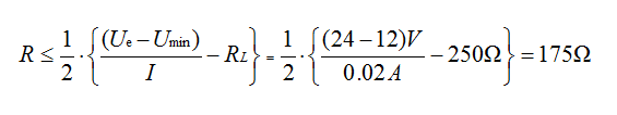 根据这个公式,可以计算出在变送器处于低工作电压时,大的导线电阻。假设:已知:Ue=24V,I=20mA,RL=250Ω,Umin=12V。求出r的大值为175Ω: