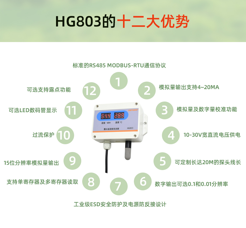 HG803-3W8P-08风管道系列温湿度变送器选用进口高精度测量单元,搭配不锈钢高度防水防细粉尘高温探头,稳定性高,漂移小,可重复性高;探头部分装有法兰,可固定在管道或箱体中,安装方便。 采用标准工业接口RS485数字信号输出。非常适用空调暖气等管道类场景的测量。