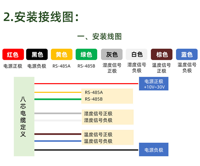 ●信号输出:①RS485信号输出,温度默认C单位版本,也可选择定制“F单位版本